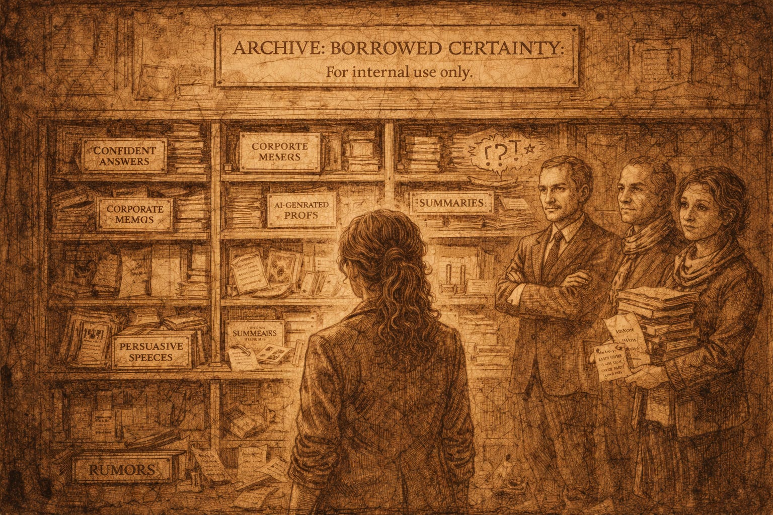 Inside were shelves of documents: AI-generated proofs, summaries, confident answers, corporate memos, persuasive speeches, marketing copy, and, disturbingly, horoscopes.