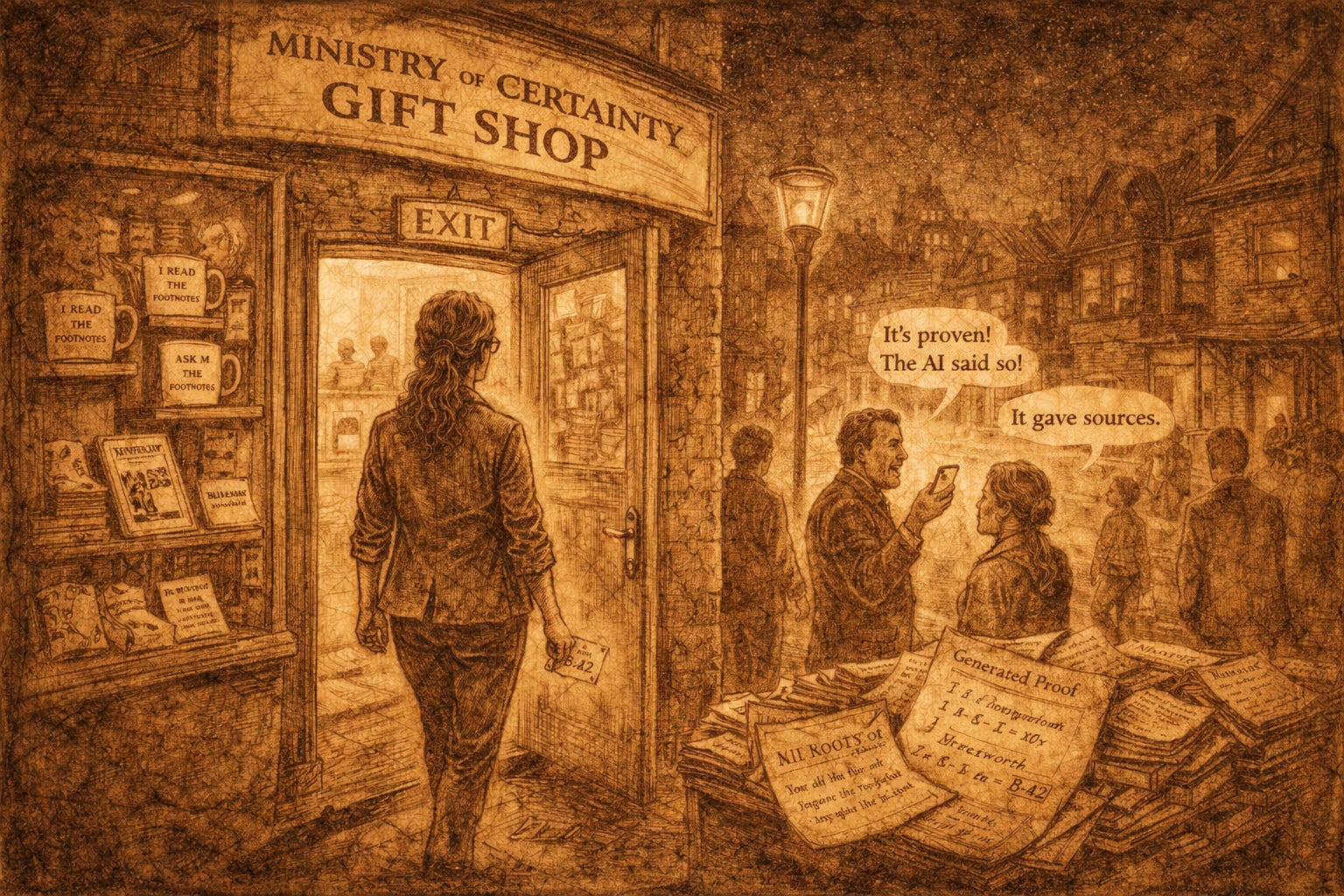 As I left the Ministry of Certainty—through a gift shop selling mugs that said “I READ THE FOOTNOTES” and t-shirts that said “ASK ME ABOUT MY EPISTEMOLOGY”—I felt the odd sensation of having been educated and mildly pranked.