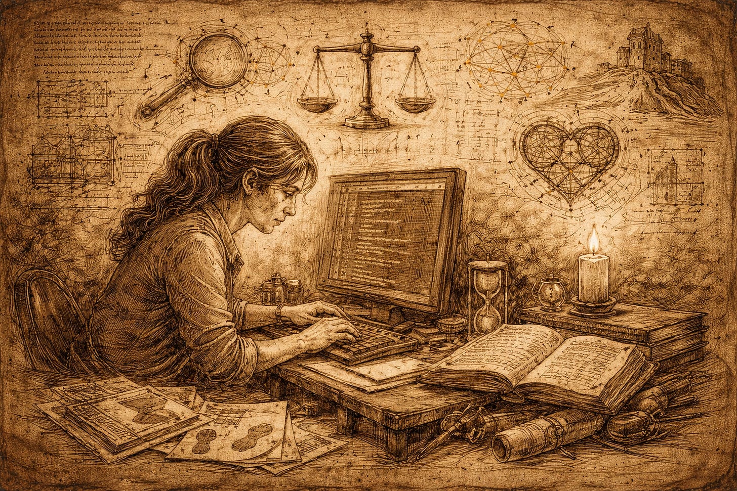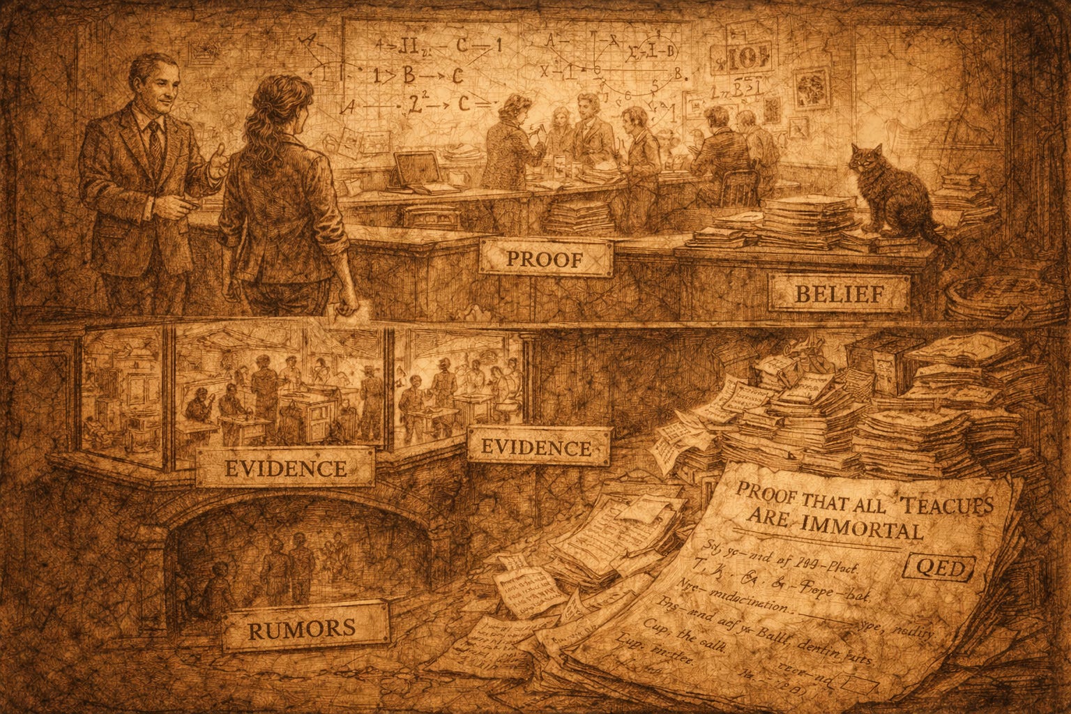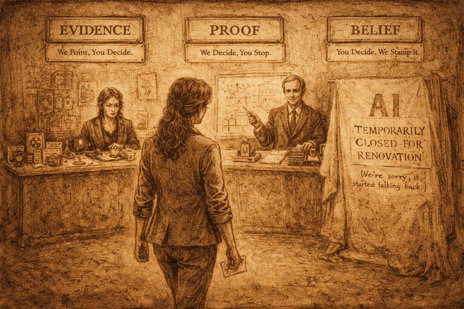 I thought of the EVIDENCE clerk with her cracked teacup, the PROOF clerk with his fragile symbols, the BELIEF clerk with their relentless stamps, and the Oracle with its warm, persuasive emptiness.