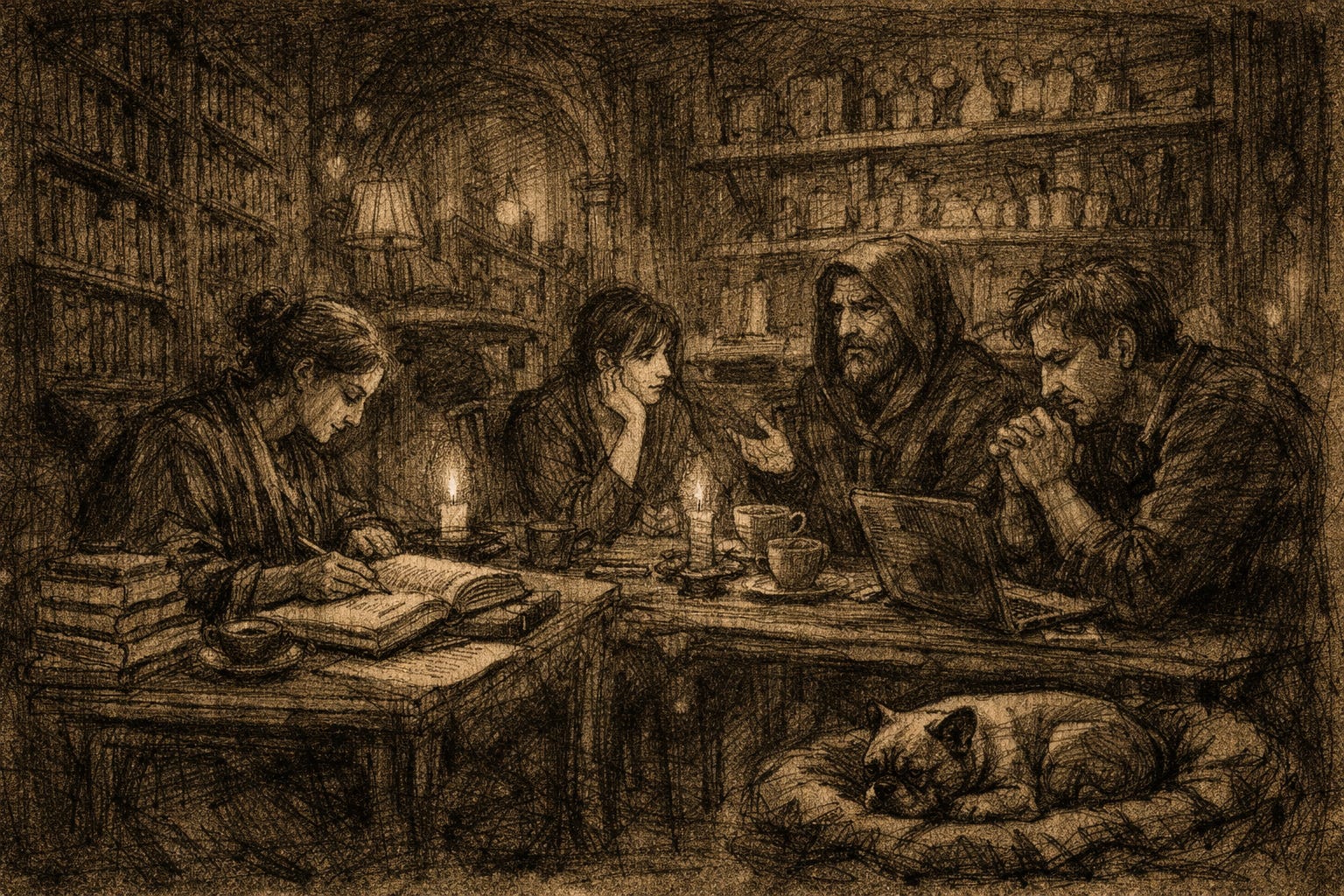 Outside, the rain had almost stopped. The street glistened as if freshly translated. Somewhere beyond the harbour the night was arranging itself into whatever came next. Inside Le Bon Mot, the cups shone quietly on their shelves, the clock lied with confidence, the candles shortened by degrees so subtle they qualified as philosophy, and the room held its usual shape: part café, part library, part refuge for people who had discovered that the most important systems in the world are never just what they contain.