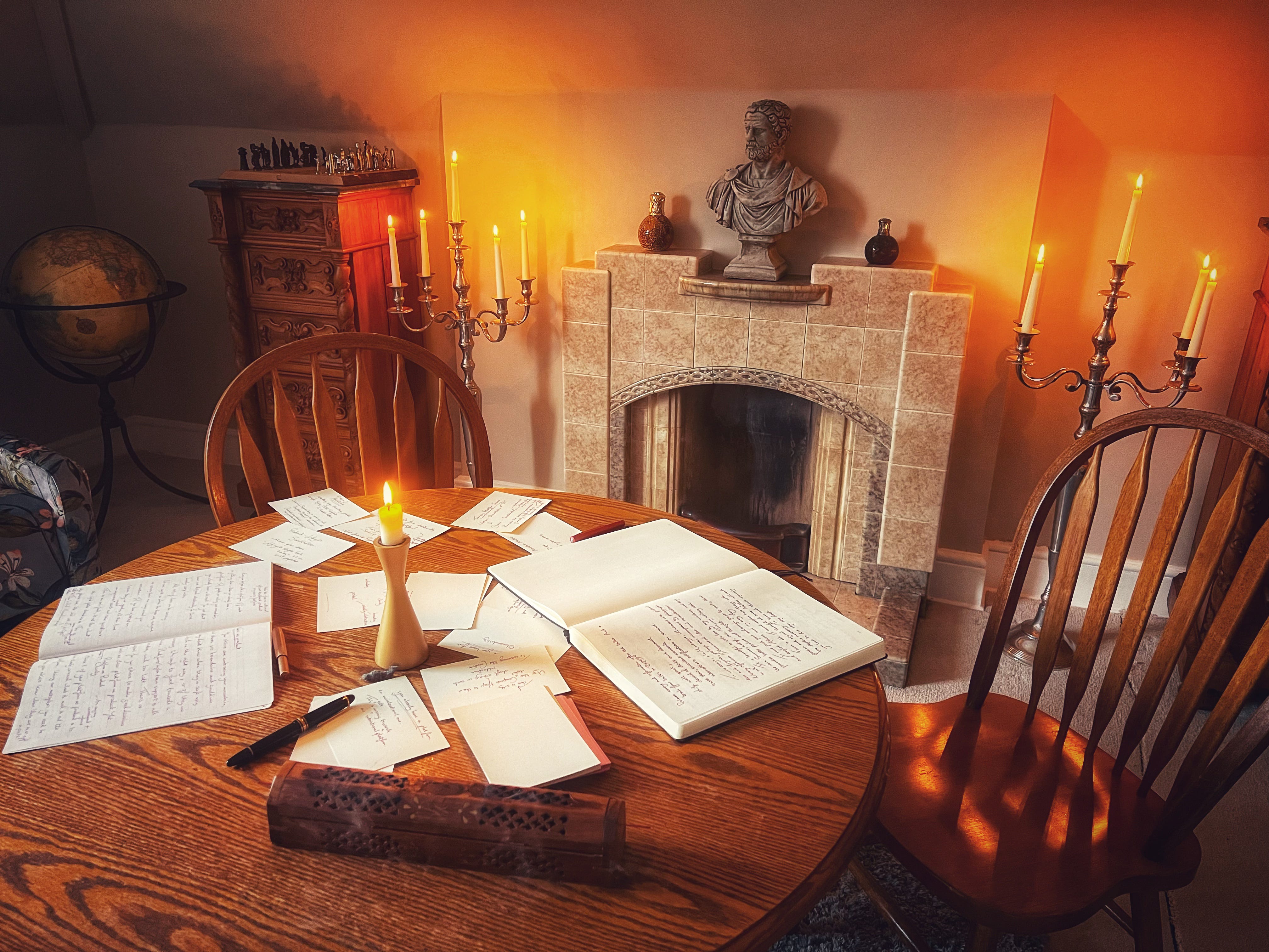 Write everything down, in a list or a mind map, your choice. Put it on cards, scraps of paper, anything at all. Have fun and use colours if you like. I've gone as far as using a quill and dipping ink, just for variety: