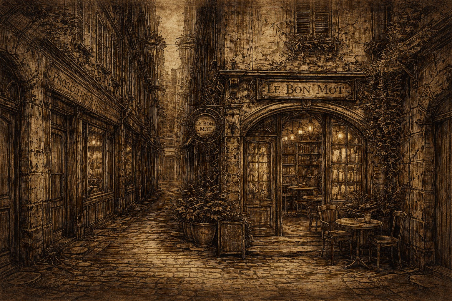Le Bon Mot is a café in the sense that it serves coffee strong enough to reboot a conscience, and a library in the sense that it contains more knowledge than is strictly safe. The entrance looks as though it has survived three architectural paradigms and one ideological purge. Inside, the shelves refuse linear obedience. Philosophy bleeds into software manuals. Gardening texts share space with systems theory. Bakery sits beside balance sheets. Reality leans conspiratorially against compliance documentation.