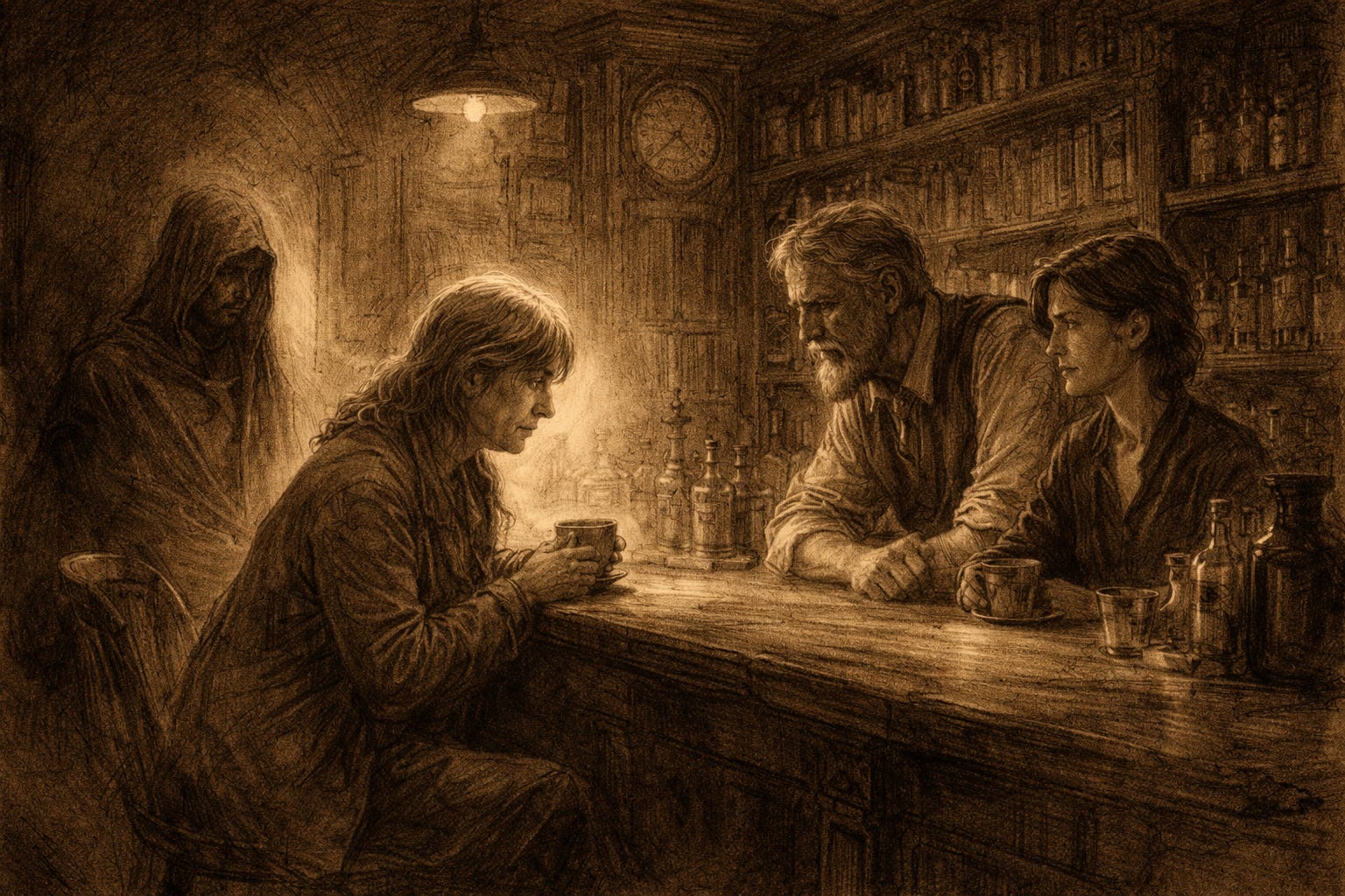 The Librarian looked up from a glass he had been polishing for longer than the glass required. Case, seated at the far end of the bar with a cortado that had gone from hot to contemplative, did not turn. She rarely did on first sound. Le Bon Mot had a way of letting arrivals become themselves before being noticed.