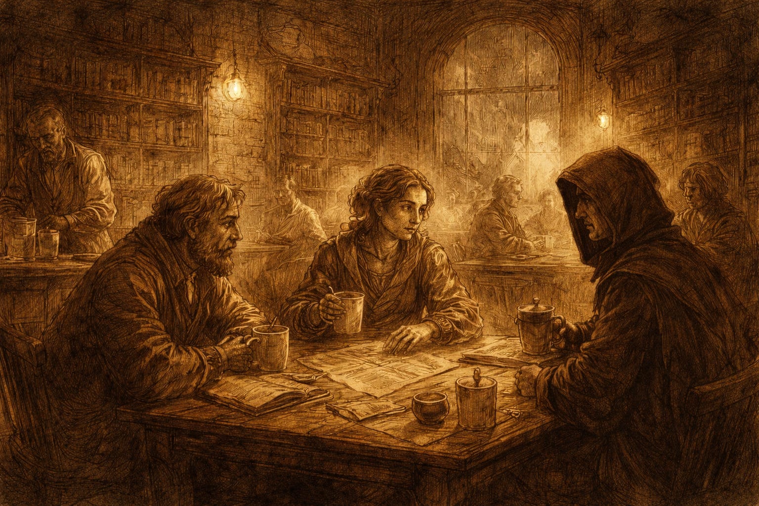 She leaned back and looked past them both, toward the counter where the Librarian was polishing a glass with the grave attention of a man editing history.