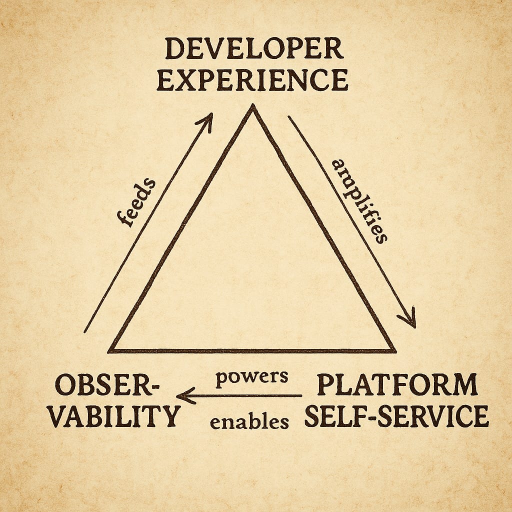 Together they form a living system. Observability builds trust; trust unlocks self-service; self-service enriches DX; and good DX fuels better observability through better care, feedback, and empathy.